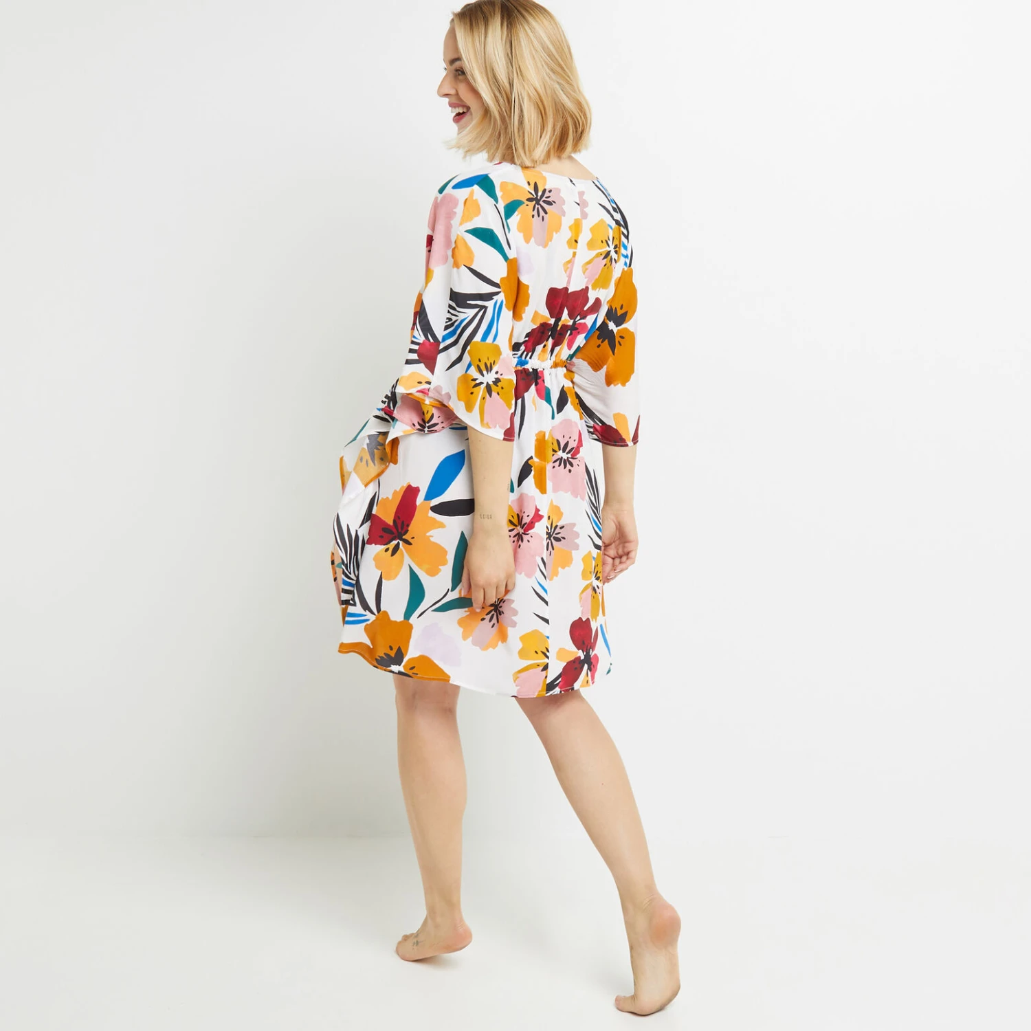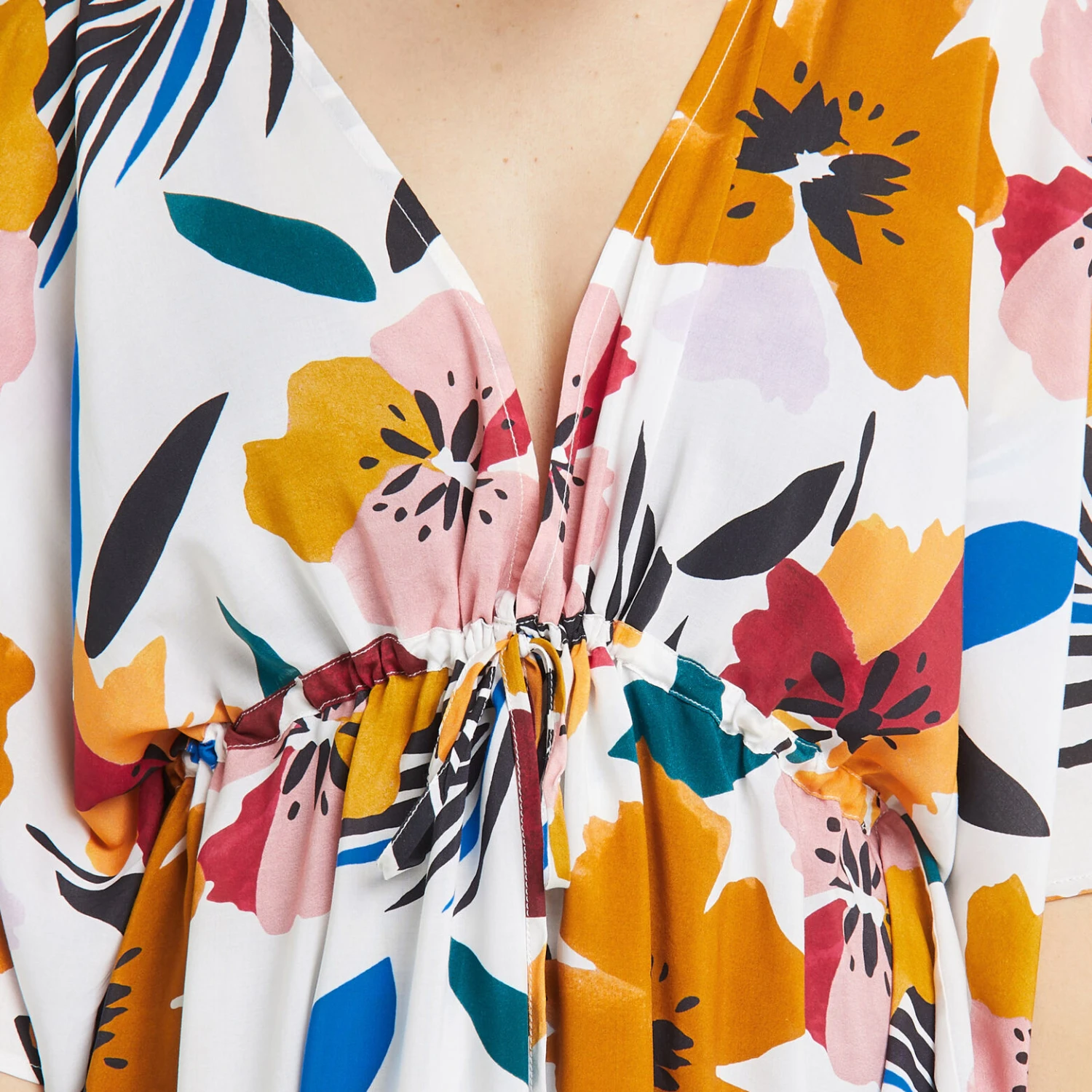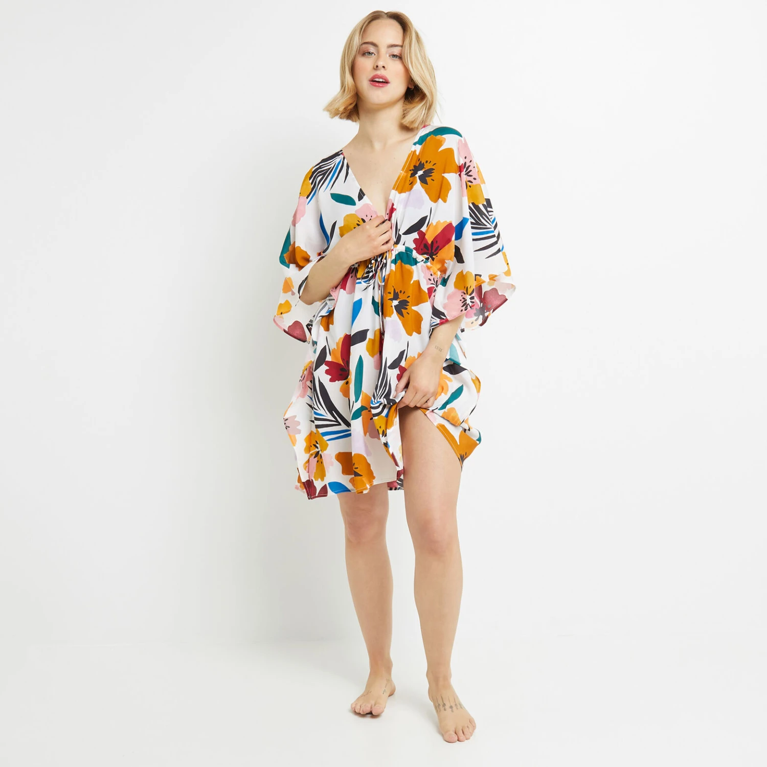 « La tunique d’été de rêve : colorée, cool, esprit vacances… surtout grâce à sa coupe ultra confort, facile et pratique à enfiler sur un maillot, et sa composition 100% viscose ecovero, conçue à partir de pulpe de bois issue des forêts durables. »