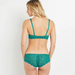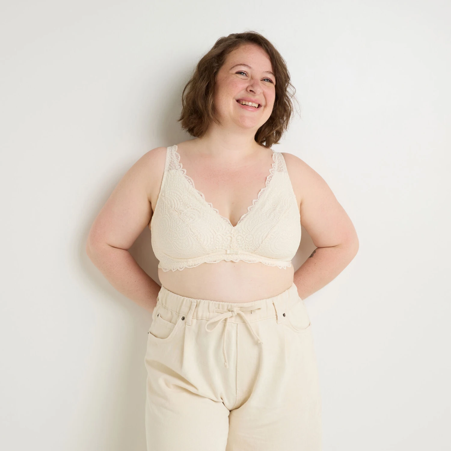 Les équipes RougeGorge soutiennent la lutte contre le cancer du sein. Cet engagement nous a permis de co-créer avec nos clientes concernées, des soutiens-gorge post-opératoires spécialement étudiés pour les femmes ayant eu une mastectomie totale ou partielle. Doux et couvrants, ils masquent les cicatrices et sont comme une caresse sur la peau. Sans armatures, élastiqués sous la basque, ils offrent un confort absolu. A l’intérieur, la doublure moelleuse en coton est sans pince pour éviter les frottements désagréables. Elle permet aussi de placer discrètement des prothèses mammaires. Bonnets habillés de dentelle jusqu’aux épaules – Décolleté et fine basque sous poitrine bord écailles – Petit noeud satiné à l’entre-seins – Bretelles élastiquées et ajustables, bouclerie ton sur ton – Dos tout en dentelle ajourée – Fermeture dos par agrafe 2 crochets 3 rangs.